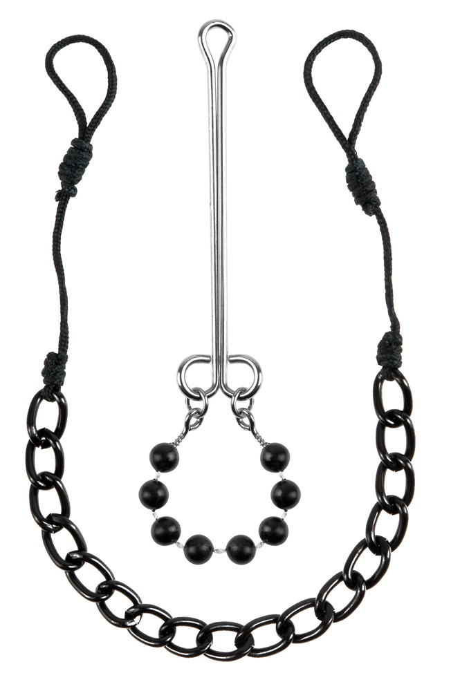 FETISH - ZACISKI NA SUTKI I ŁECHTACZKĘ Z ŁAŃCUSZKIEM PEREŁKOWYM CZARNE