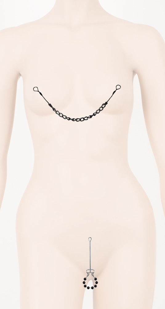 Ten intymny zestaw biżuterii, składający się z łańcucha sutkowego i zapięcia łechtaczki, podkreśla i zdobi kobiece punkty zapalne oraz daje stymulujące uczucie noszenia. Końcowe pętle łańcucha piórkowego umieszczane są wokół sutków i delikatnie dokręcane za pomocą suwaków. Elastyczne zapięcie łechtaczki z stymulująco kołyszącym się wieńcem perłowym delikatnie chwyta łechtaczkę. A wszystko to bez kolczykowania - idealne do poznania intymnej biżuterii!