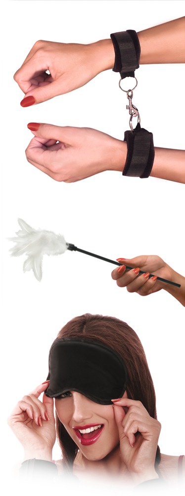 Z tym 3-częściowym zestawem, początkujący w sesjach soft BDSM otrzymają to, co jest warte ich pieniędzy. Zestaw zawiera kajdanki, sprężynowy pręt i nieprzezroczystą satynową maskę na oczy. Kajdanki wyposażone są w regulowane paski na rzepy i połączone karabinkiem.