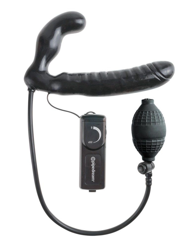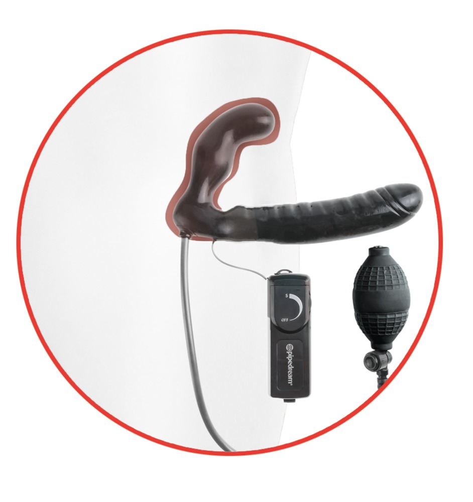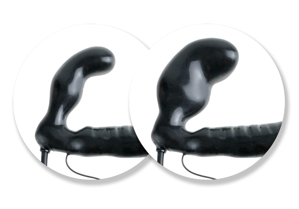 Pasek z podwójnym dildo, funkcją wibracji i pompy. Krótkie dildo wprowadza się do pochwy (lub odbytu) i trzyma za mięśnie pochwy (lub odbytu). Dildo jest następnie pompowane za pomocą pompy kulowej, aby zapewnić ściślejsze dopasowanie i pełniejsze uczucie. Wyposażony w ten sposób partner może być teraz rozpieszczany dłuższym, wyraźnie żyłkowanym naturalnym dildo. Przy włączonych wibracjach przyjemność staje się jeszcze bardziej intensywna. Pompa kulowa z bezpiecznym zaworem ciśnieniowym. Wibracje wielobiegowe z przewodowym pilotem zdalnego sterowania dla łatwej kontroli. (Prosimy zamawiać osobno baterie: 2 x AA)