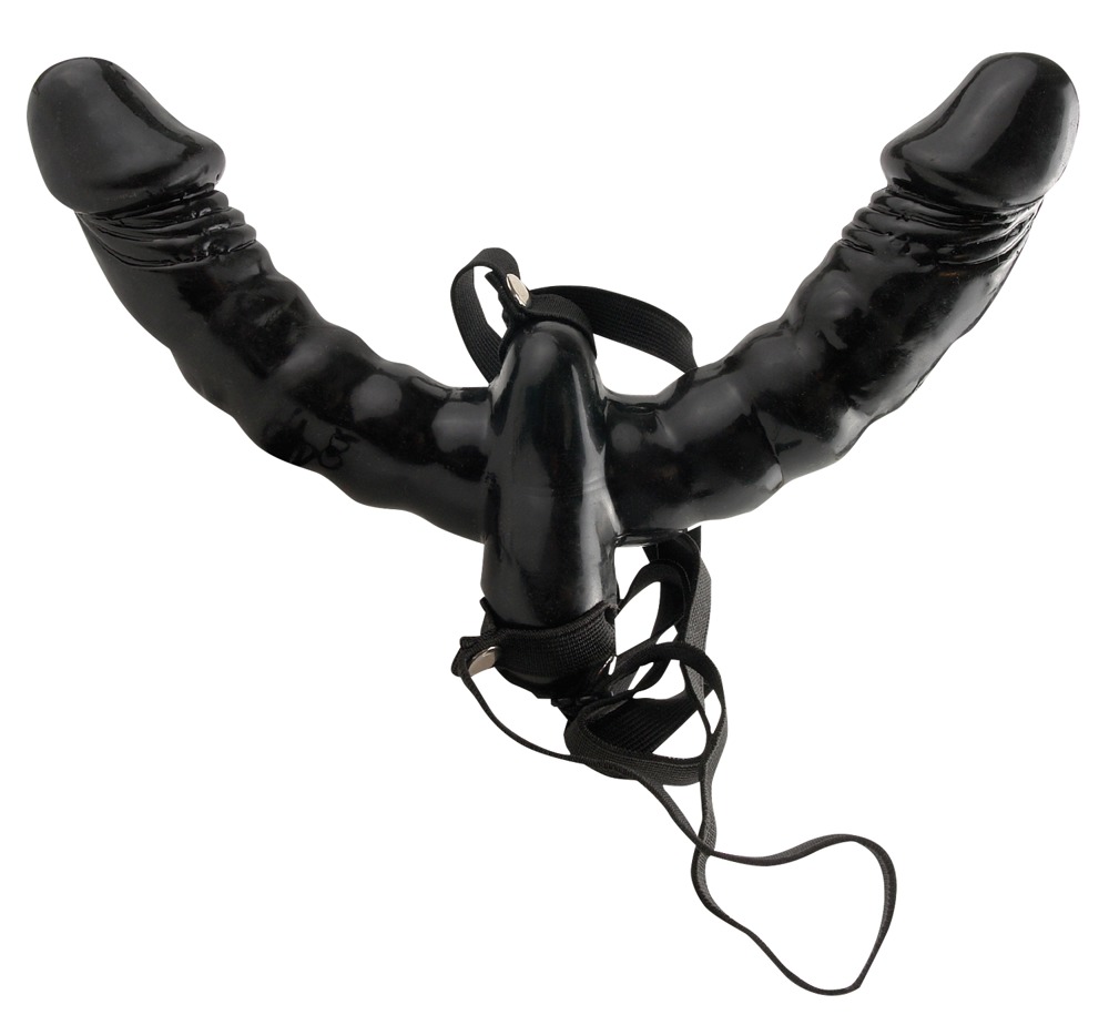 Czarny, regulowany elastyczny pas z dwoma czarnymi, żłobionymi wibratorami w kształcie penisa. Oba wibratory można oddzielnie regulować za pomocą przewodowego pilota.