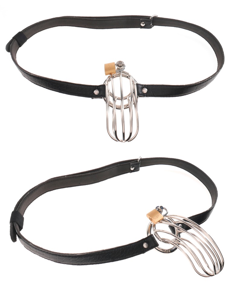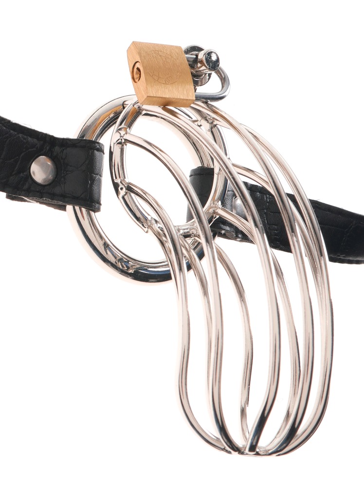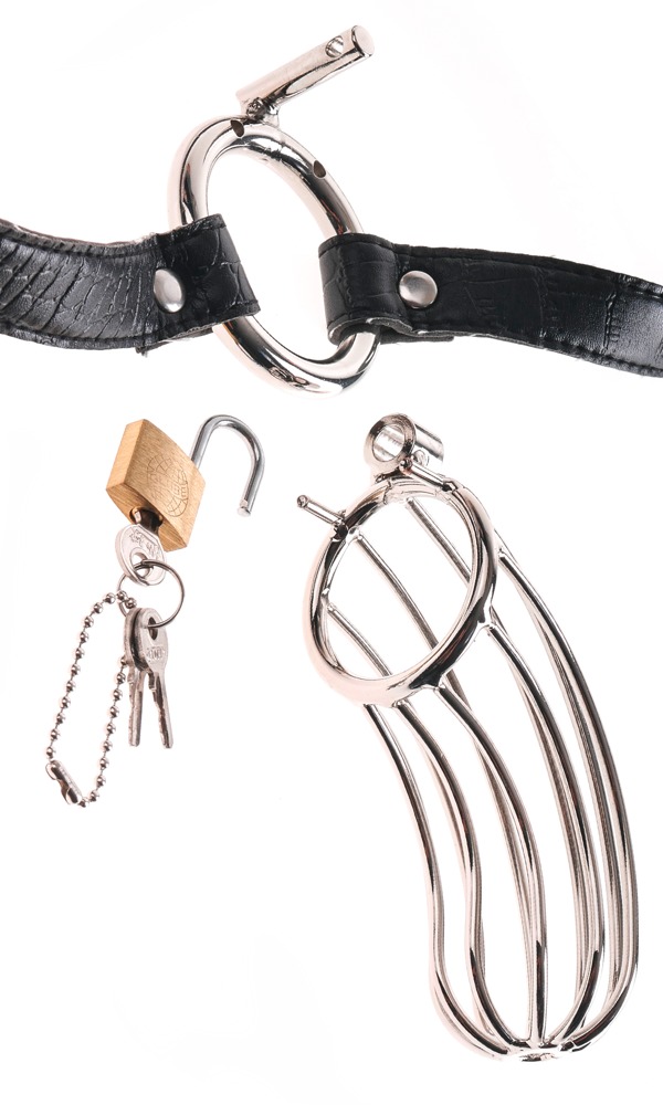 Ta klatka czystości dla penisa nie tylko wygląda wspaniale, ale również dostarcza niepowtarzalnych uczuć przymusowej abstynencji! Idealnie dopasowana do męskiej anatomii, klatka penisa jest łatwa do założenia i zdejmowania: Złóż skórzany pas biodrowy, nie wyprostowany penis wchodzi do klatki i jest zablokowany na O-ringu pasa biodrowego. Oczywiście klatka jest zamykana na zamek i klucz. Osoba nosząca może jednak nadal bez problemu oddawać mocz i brać prysznic lub kąpać się. Klatka na penisa wykonana jest z wysokiej jakości stali nierdzewnej i polerowana ręcznie. Skórzany pas biodrowy o wężowym wyglądzie jest regulowany rozmiarami.