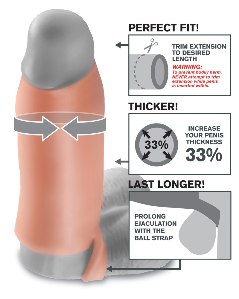 Pokrowiec penisa wykonany z miękkiego, przypominającego skórę, rozciągliwego materiału (Real Feel) nadaje penisowi górny kształt dla spełnienia chwil pożądania. Ściśle przylegająca pokrywa jest po prostu wsuwana na penisa we wzwodnym stanie i dzięki pierścieniowi jąder zapewnia pewne i wygodne dopasowanie bez ześlizgiwania się. Dzięki wspaniałej średnicy zewnętrznej, penis jest o 33% większy w obwodzie. Poszewka jest otwarta w górnej części w celu odsłonięcia wrażliwych żołędzi i w razie potrzeby może być skrócona nożyczkami dla idealnego dopasowania.