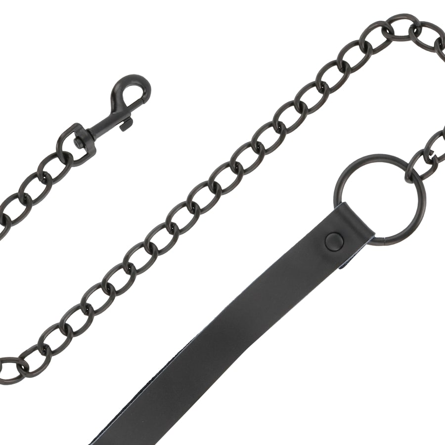 Smycz z łańcuszkiem przylega do pierścienia na obroży za pomocą obrotowego haczyka, który kończy się pętlą do trzymania i prowadzenia swojego partnera jakby był posłusznym zwierzakiem!