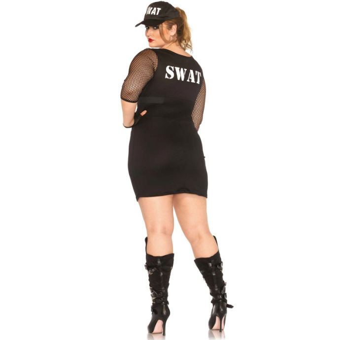 Zestaw kostiumów oficerskich SWAT zawiera zapinaną przednią sukienkę z siateczkowymi rękawami i dołączonym paskiem, opaską na ramię, zabawkową walkie-talkie, rękawiczki bez palców i czapkę SWAT, renomowanej marki bielizny Leg Avenue.