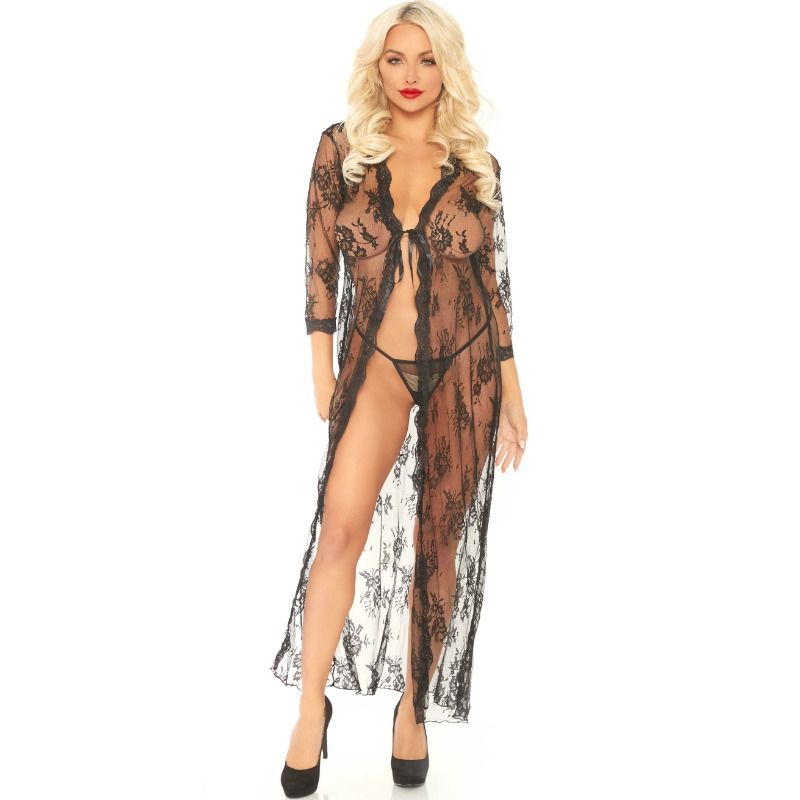 Długi szlafrok z koronką z falistym wykończeniem, satynową tasiemką i dopasowanymi stringami, renomowanej marki bielizny Leg Avenue.