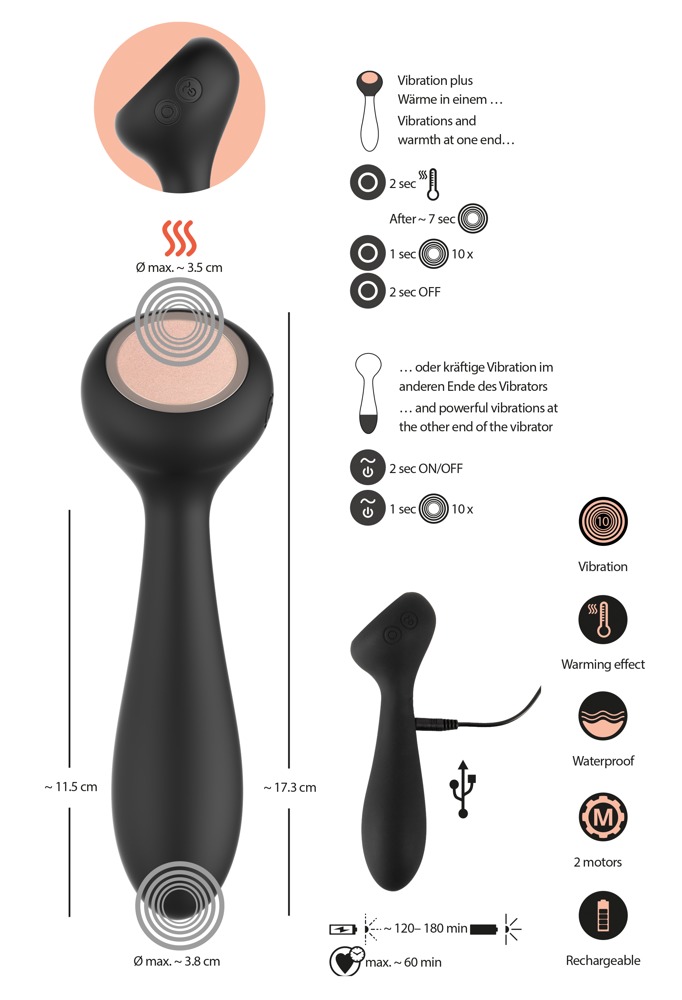 2 silniki zapewniają 10 trybów wibracji w każdej końcówce, a także przyjemne ogrzewanie. Każdy silnik można wygodnie kontrolować oddzielnie za pomocą przycisku umieszczonego bezpośrednio na zabawce. Nawet w wodzie i pod wodą, ponieważ ta zaawansowana zabawka jest wodoodporna.