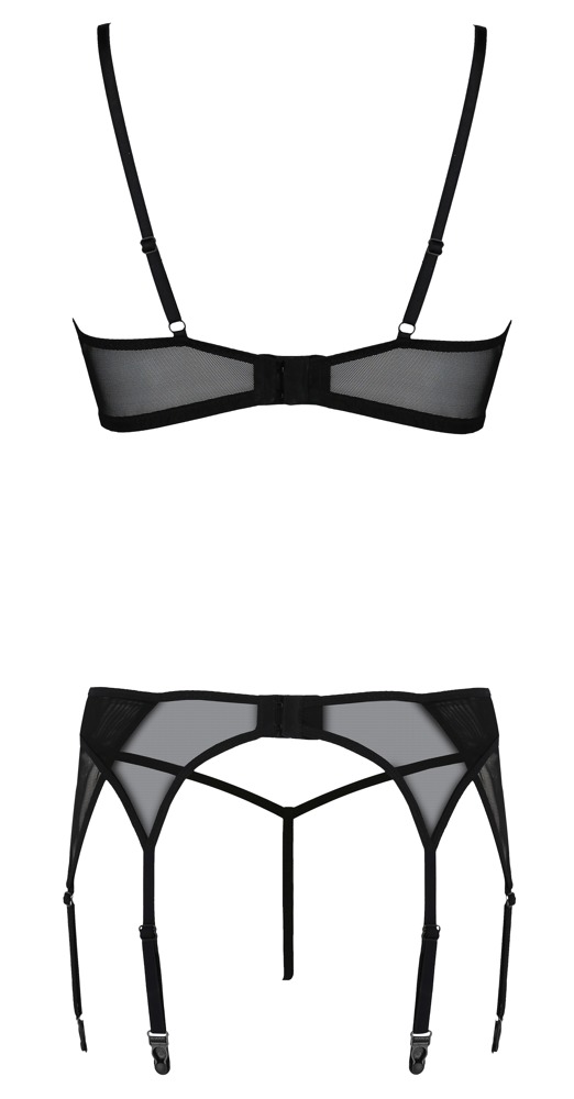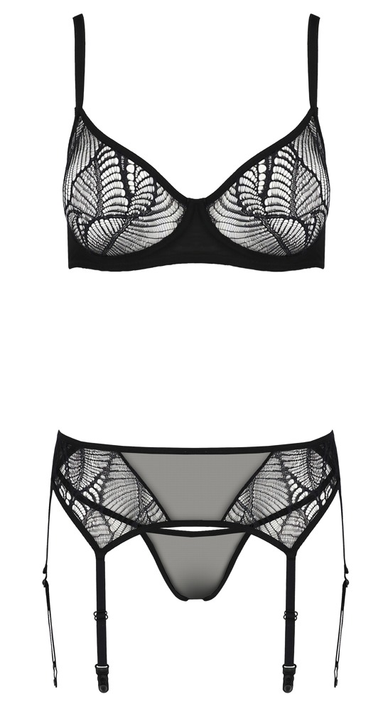 Biustonosz na fiszbinach, pas do pończoch i stringi w komplecie Leafa z kolekcji Eco marki Passion. Wszystkie trzy części są wykonane z przezroczystej elastycznej powernetu, biustonosza i pasa do pończoch w połączeniu z fantazyjną koronką z przodu. Pas do biustonosza i szelek z zapięciem na haftki z tyłu, 6 szelek (po 3 z każdej strony) i ramiączka biustonosza mają regulowaną długość, dzięki czemu można je dopasować.