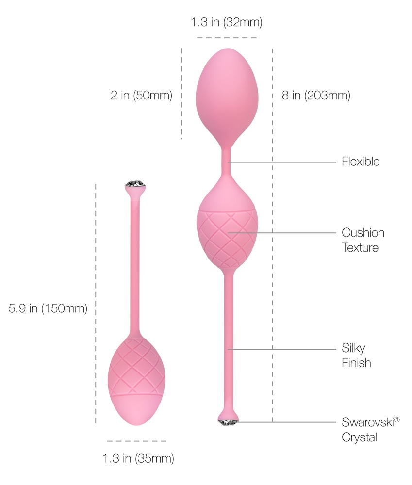 Zestaw piłeczek miłosnych, składający się z 1 pojedynczej piłki i 1 duetu piłeczek w kształcie elipsy wraz z elastyczną taśmą powrotną z kryształem Swarovski®. Piłki miłosne doskonale nadają się do ćwiczeń dna miednicy: wewnątrz, obracające się ciężarki wywołują wibracje przy każdym ruchu, które prowadzą do wzmocnienia skurczów mięśni. Wizualnie, Love Balls przekonują swoim szlachetnym wzornictwem i modnym wyglądem pikowanych wzorów. Z jedwabistą, miękką w dotyku powierzchnią.