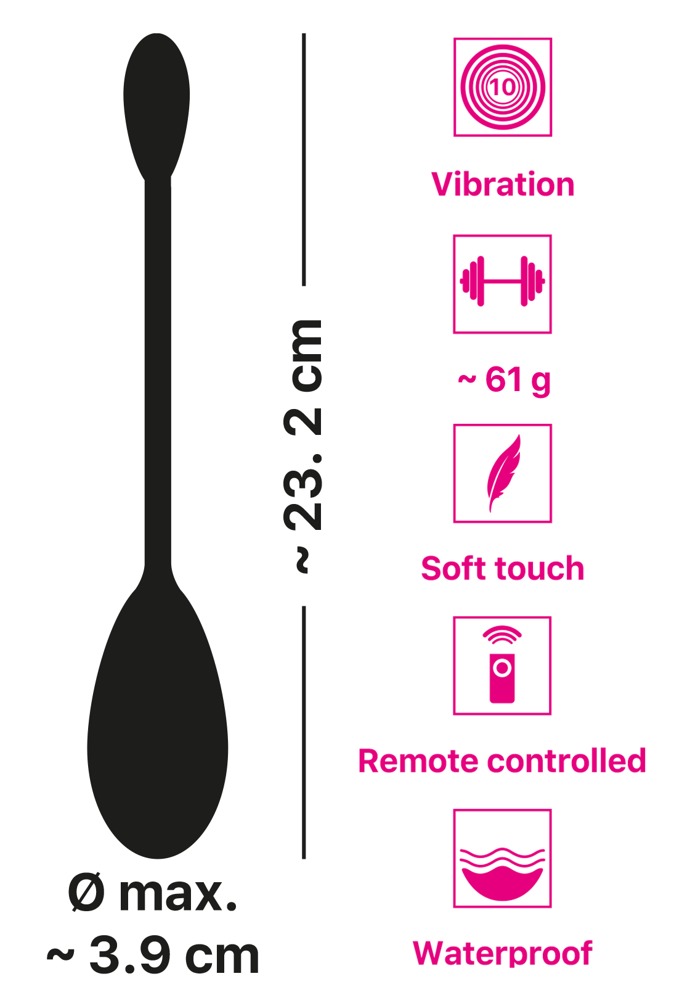 Długość całkowita 23,2 cm (pasek powrotny 15,2 cm). Wibro jajo o długości 8 cm, Ø maks. 3,9 cm. Masa 61 g. Silikon, PU, ABS.