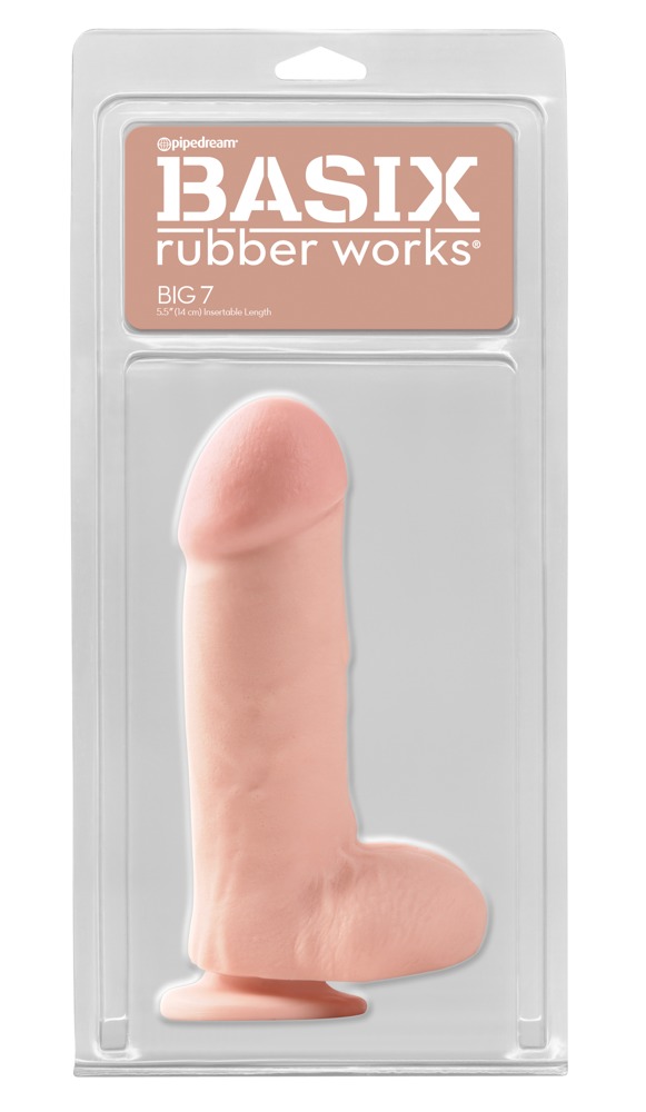 Naturalne dildo Big 7" od Basic Rubber Works z uwydatnioną żołędzią, żyłkami i jądrami. Podstawa ssąca pozwala na jazdę bez użycia rąk. Oczywiście dildo jest również kompatybilne z strap-onami.