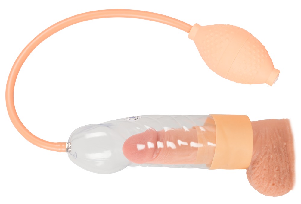 Przezroczysta prezerwatywa na potencję z poręczną pompą próżniową.