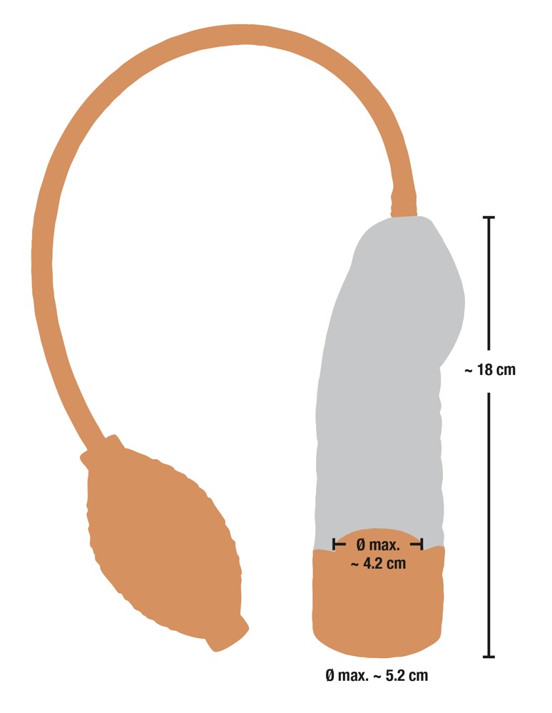 17,2 cm głębokości, Ø wewnątrz 5,2 cm, Ø na zewnątrz 5,4 cm. Ø otwór tulei rozprężnej 4 cm. Odpowiedni dla wszystkich rozmiarów penisa. Materiał: ABS, PVC, lateks (wykonany z naturalnej gumy lateksowej, która może powodować alergie).