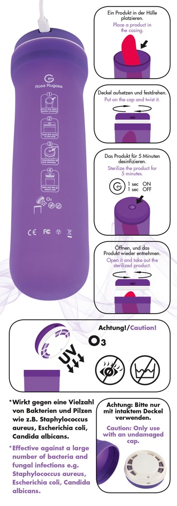 Praktyczny i higieniczny sterylizator, który zabija do 99,9% bakterii i zarazków za pomocą promieniowania UV. Pudełko czyszczące jest niezawodnie skuteczne przeciwko dużej liczbie bakterii i grzybów, takich jak Staphylococcus aureus, Escherichia coli, Candida albicans. Obsługa jest szczególnie intuicyjna: wystarczy włożyć zabawkę do węża i zamknąć pokrywę. Po 5 minutach zabawka jest sterylizowana i ponownie gotowa do użytku. Nieodzowne narzędzie dla każdego miłośnika zabawek. Możliwość ładowania za pomocą dołączonego do zestawu kabla ładującego USB.