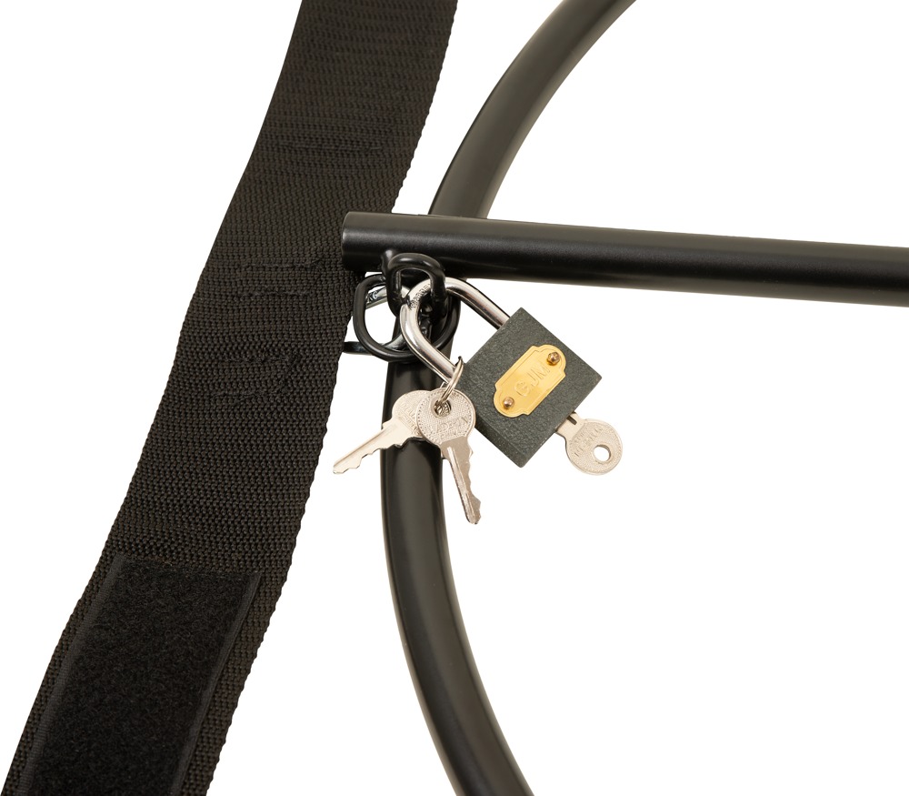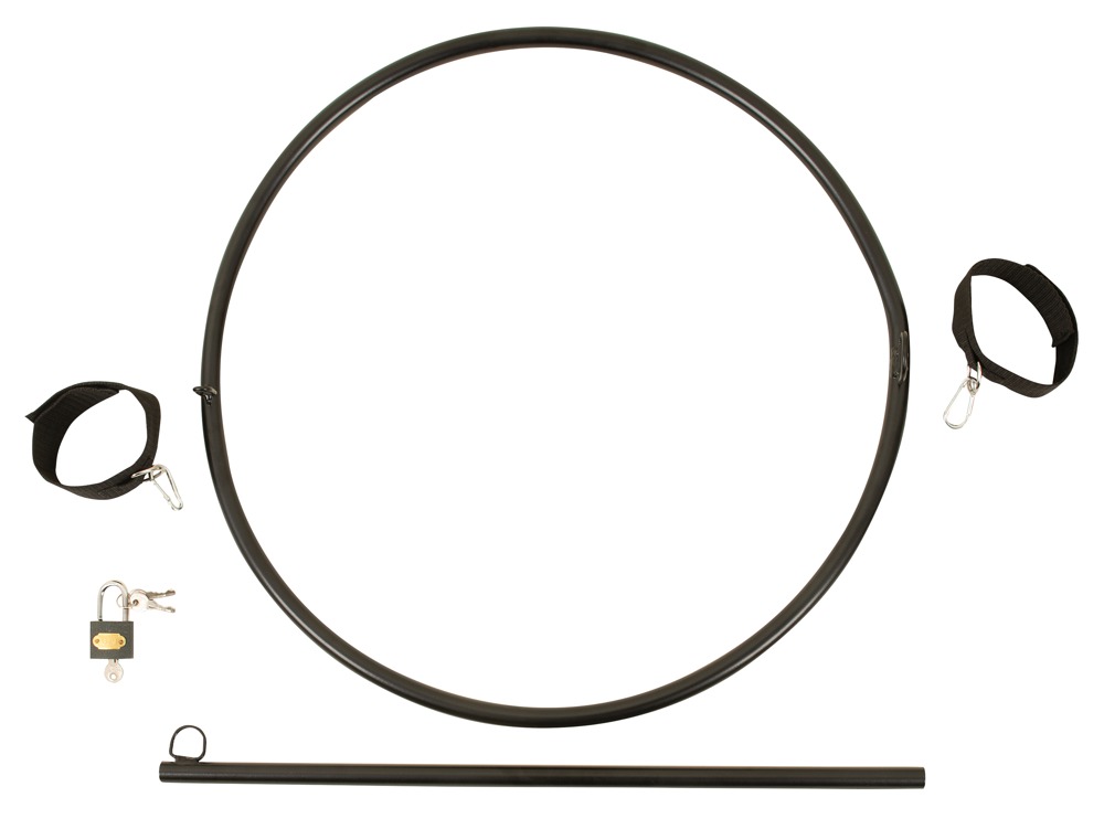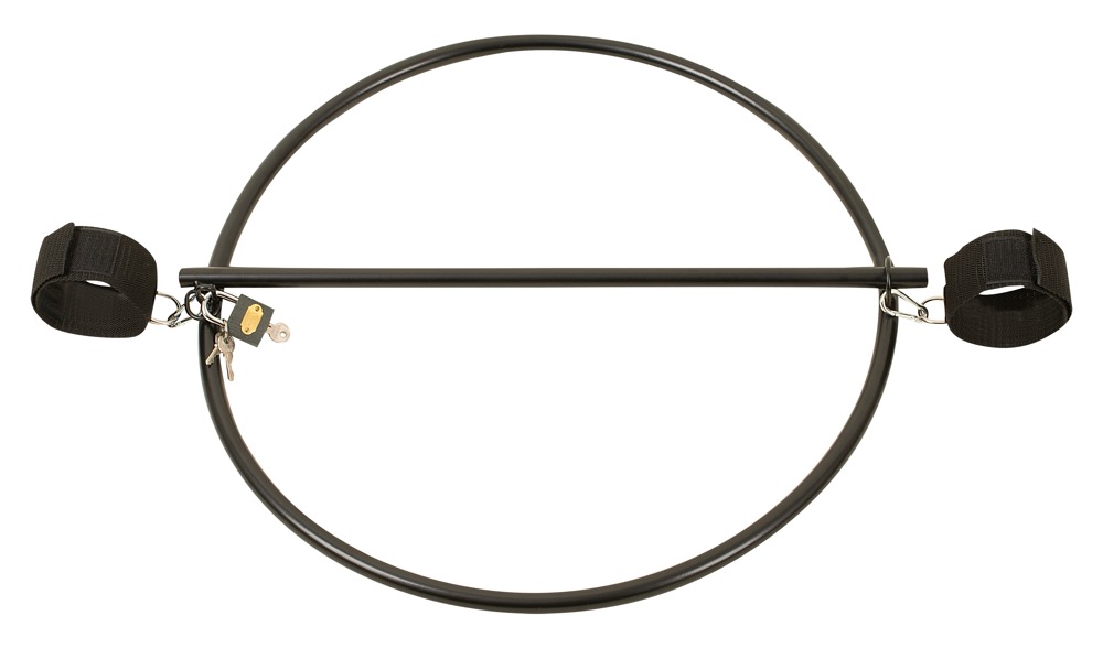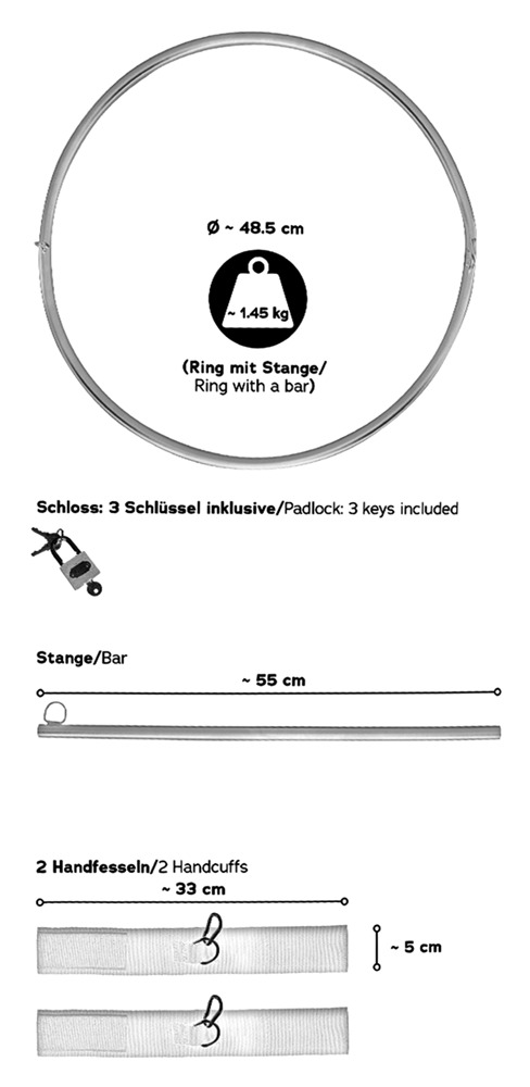 Pierścień do bondage marki You2Toys z kajdankami - zamek i 3 kluczyki w zestawie! Pierścień do bondage (Ø 48,5 cm) jest bardzo wytrzymały i stabilny dzięki grubości materiału 1,6 cm. Poprzeczkę (o długości 55 cm) należy przełożyć przez mały pierścień boczny i mocno zablokować zamkiem na drugim pierścieniu bocznym. Odporne na rozdarcie paski kajdanek są również mocno przymocowane do każdego z bocznych pierścieni. Paski kajdanek mają szerokość 5 cm i są regulowane w obwodzie za pomocą zapięć na rzepy.