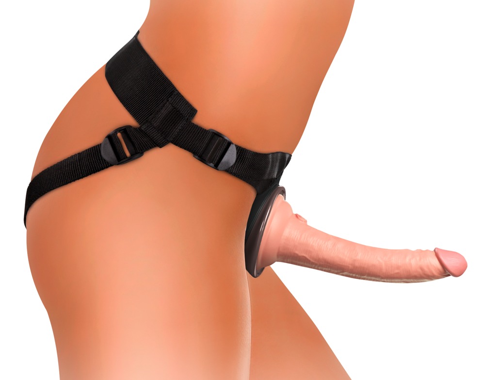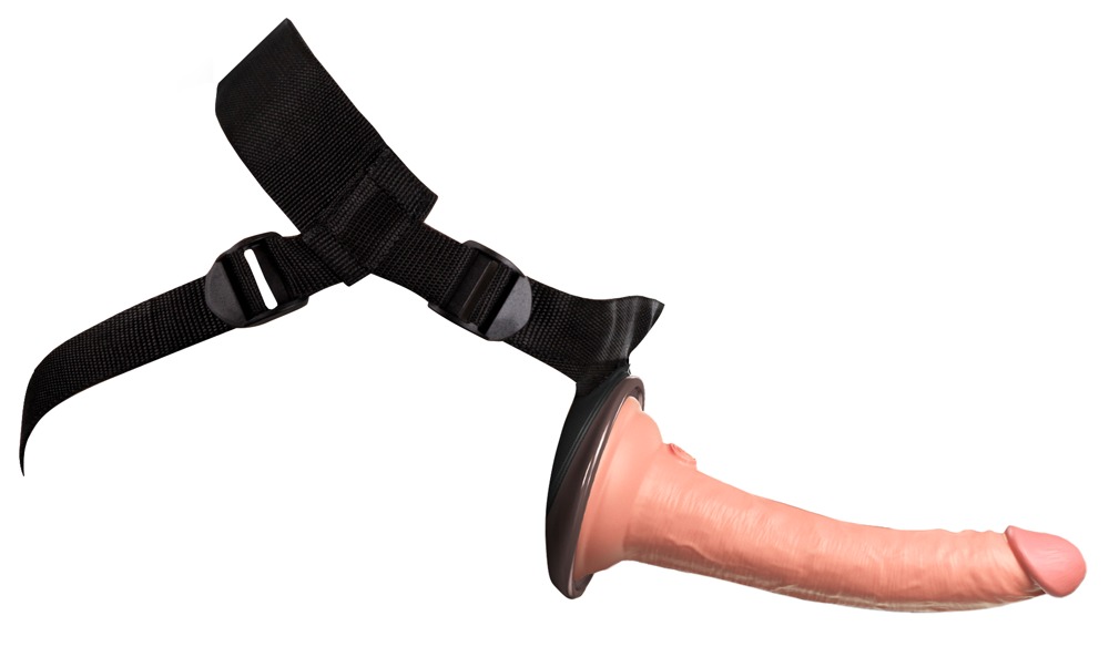 Prosty system strap-on oparty jest na anatomicznie zakrzywionej płytce korpusu z wgłębieniem dokującym, w którym stopka ssąca wibratora jest mocowana/dokręcana w sposób odporny na wstrząsy (Push & Play). Miękko wyściełana płyta korpusu równomiernie rozkłada nacisk na obszar miednicy, dzięki czemu unika się punktowego, niekomfortowego ucisku. Wytrzymałe, szerokie paski można regulować za pomocą plastikowych suwaków, co zapewnia pewne i wygodne dopasowanie. Każdy inny konwencjonalny wibrator/dildo może być również zamocowany w stacji dokującej do ciała.