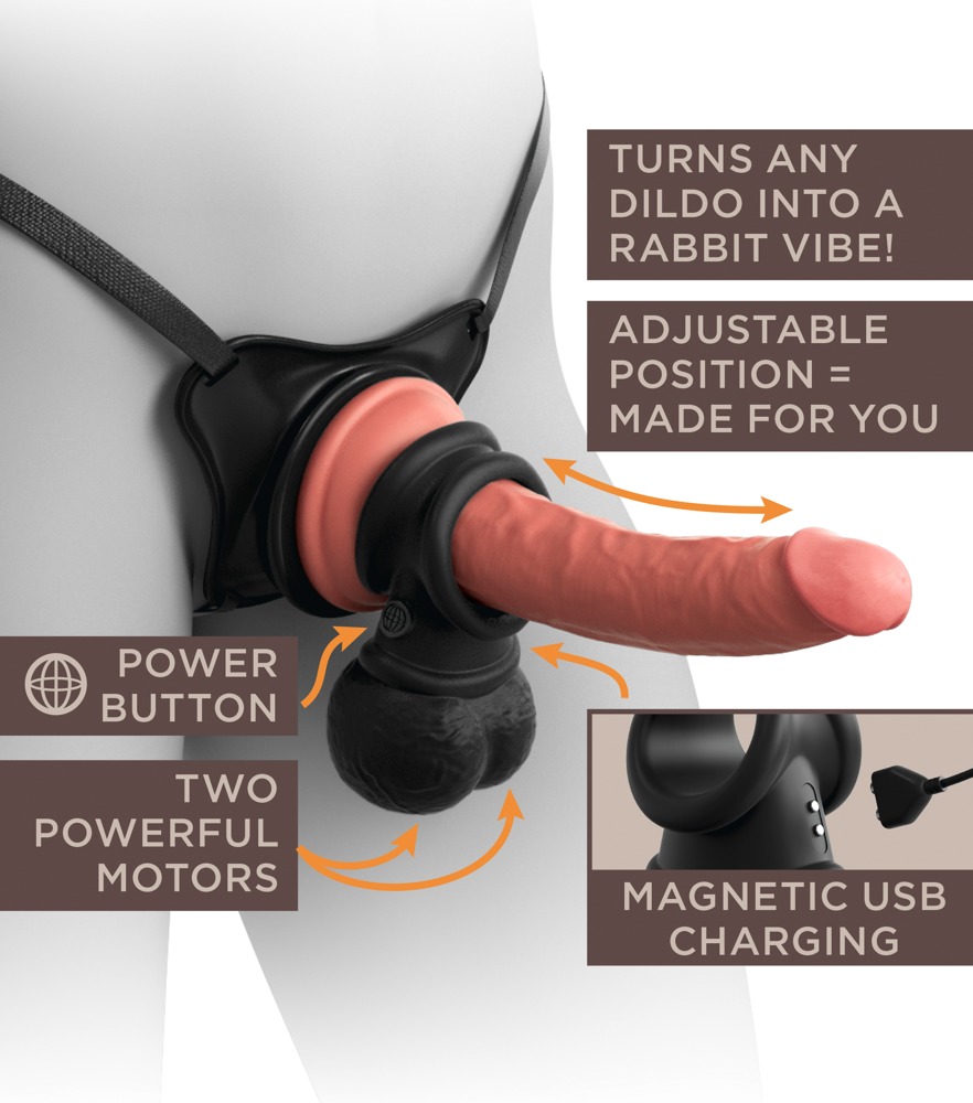 Zestaw Ultimate Vibrating Silicone Body Dock Kit od King Cock Elite zawiera wygodny strap-on Comfy Body Dock, bardzo realistyczny 7-calowy wibrator naturalny Vibrating + Dual Density Silicone Cock oraz pierścień na penisa z ważkimi wibrującymi wibro-sękami Vibrating Swinging Crown Jewels. Dodatkowo bezprzewodowy pilot zdalnego sterowania (RC) umożliwia wygodne sterowanie wibracjami.