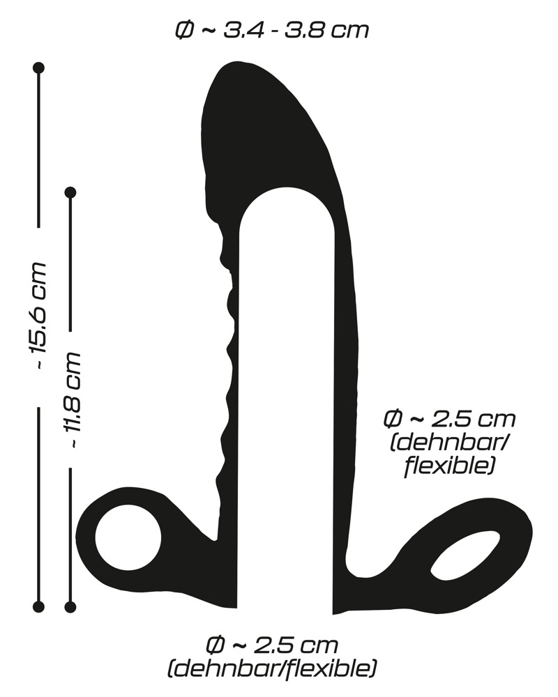 Długość całkowita płaszcza 15,6 cm, głębokość wprowadzenia 11,8 cm, długość wprowadzenia 13,8 cm, Ø zewnętrzna 3,4 cm do 3,8 cm, Ø wewnętrzna 2,5 cm, rozciągliwy. Pierścień na jądra Ø 2,5 cm, rozciągliwy. 123 g. TPE, ABS.