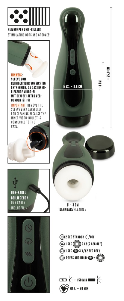 Poręczny, smukły masturbator z 2 funkcjami od Rebel, który łączy w sobie ssanie i wibracje. 6 trybów wibracji i 3 tryby ssania zapewniają przyjemną różnorodność i mogą być kontrolowane oddzielnie za pomocą przycisku bezpośrednio na zabawce.
