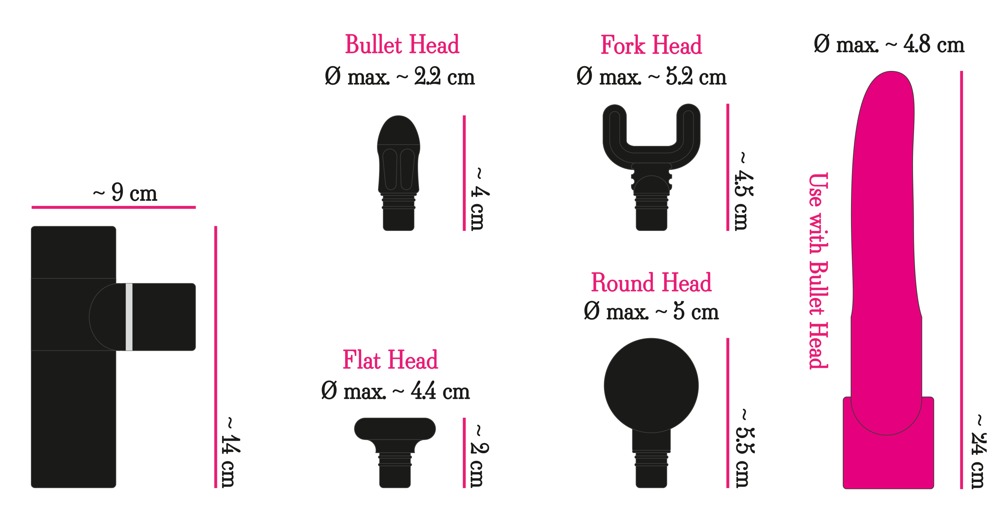 Pistolet do masażu Sex & Massage Gun marki You2Toys z 4 różnymi nasadkami i puszystym silikonowym dildo do przymocowania. Ręczny masażer działa dzięki szybkim, bezpośrednim i silnym wstrząsom, które są przenoszone na odpowiednią przystawkę lub dildo, ale są ledwo wyczuwalne w rękojeści. 4 prędkości uderzeń (1600 do 3200 uderzeń na minutę) są wygodnie regulowane za pomocą przycisku bezpośrednio na uchwycie i zapewniają wszechstronną (głęboką) przyjemność masażu - w i na ciele. Przy głośności < 55 decybeli bardzo cichy i dyskretny. Ważący zaledwie 521 g, kompaktowy pistolet do masażu wygodnie leży w dłoni, jest przyjemny w trzymaniu i gotowy do użycia szybko i w ruchu. Możliwość ładowania - w zestawie kabel USB do ładowania.