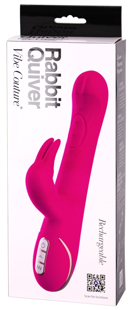 Elastyczny wibrator króliczek Quiver od Vibe Couture z pulsującą kulką masującą w trzonie punktu G i ekscytującymi wibracjami w stymulatorze łechtaczki. Co najmniej 3 silniki zapewniają 3 prędkości pulsującej kuli masującej i 7 trybów wibracji dla podwójnej przyjemności. Wszystkimi funkcjami można wygodnie sterować za pomocą jednego przycisku bezpośrednio na zabawce - osobno lub w połączeniu.