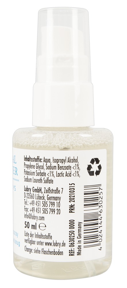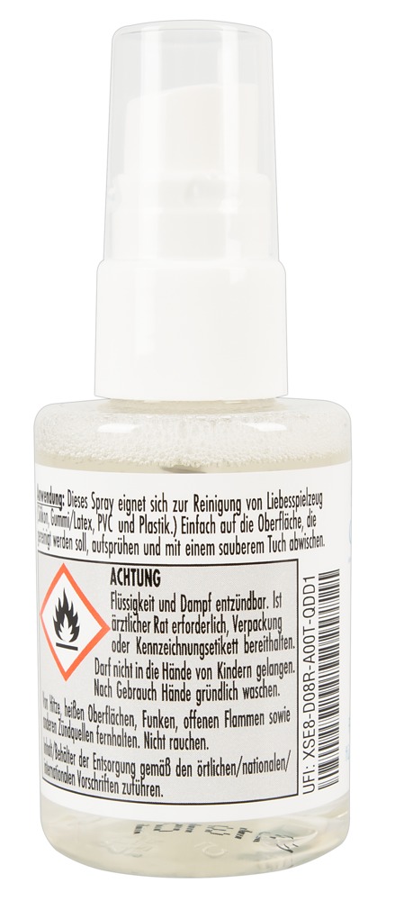 Wegański spray czyszczący do zabawek erotycznych. Stosuje się do materiałów wykonanych z gumy/lateksu, silikonu, PCV i tworzyw sztucznych. Rozpuszczanie białek. Zastosowanie: Spryskać czyszczoną powierzchnię i przetrzeć czystą szmatką. Produkt zawiera izopropanol.