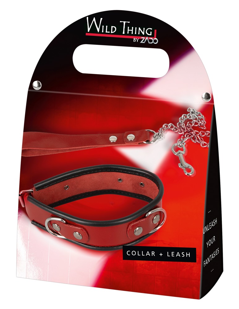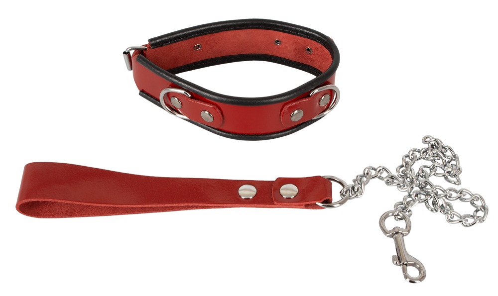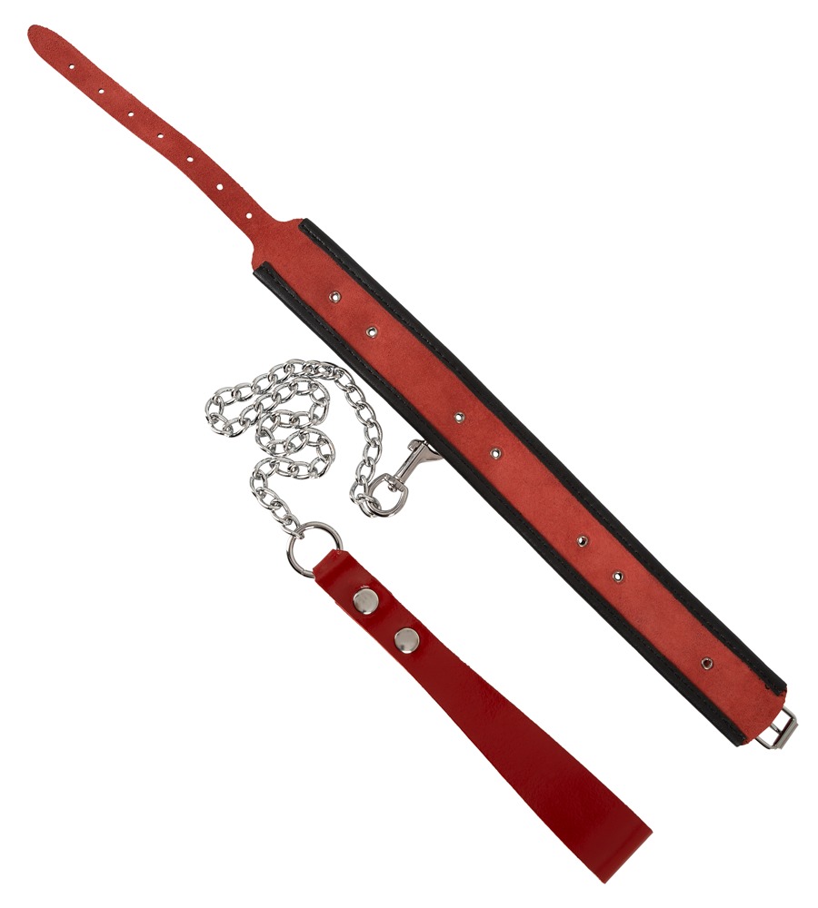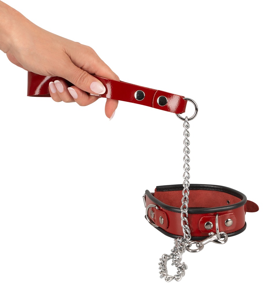 Niewyczerpany mankiet na szyję wykonany z czerwonej skóry patentowej, wykończony czarną lamówką. Z przodu i z boku po jednym kółku do zawieszenia dołączonej smyczy. Z zapięciem na klamrę z możliwością regulacji obwodu od 34 cm do 44 cm. Smycz łańcuchowa z karabinkiem i pętlą na rękę wykonana z lakierowanej skóry o długości 85 cm.