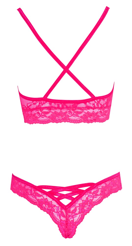Miękki biustonosz i majtki wykonane z miękkiej koronki. Biustonosz z rozciągliwymi paskami, które biegną w poprzek pleców. Odpusty z przodu i na dole z przeciętnymi paskami.