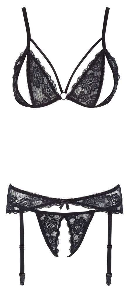 Ten trzyczęściowy zestaw do zawieszania uwodzi delikatną kwiatową koronką. Biustonosz z regulowanymi ramiączkami urzeka detalami na ramiączkach przy dekolcie oraz ekscytującymi miseczkami z rozcięciami - podkreślonymi ozdobnym pierścieniem. Pasujący pas do szelki jest wąsko wycięty i posiada regulowane szelki. Obie części bielizny są zamykane z tyłu praktycznym klipsem. Zespół jest zakończony całkowicie otwartym smyczkiem.