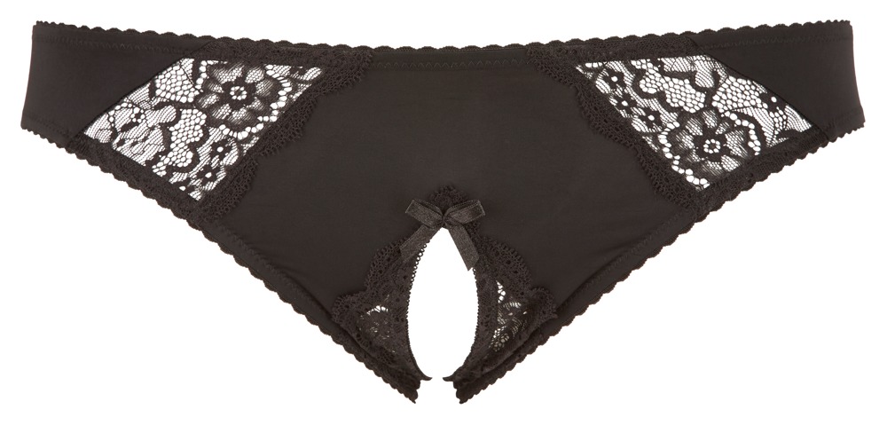 Dopasowane majtki z elastycznymi wstawkami z koronki z przodu. Otwarte krocze podkreślone jest ozdobną kokardką.
