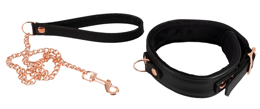 Pasy do krępowania szyi i smycz w zestawie od Bad Kitty. Mankiet i pasek na nadgarstek z czarnej skóry o szlachetnym wyglądzie, smycz łańcuszkowa i metalowe elementy w kolorze różowego złota. Ogranicznik na szyję wyściełany od wewnątrz miękkim pluszem, z przodu posiada kółko do przypięcia dołączonej smyczy. Możliwość regulacji obwodu od 30 cm do 40 cm za pomocą zapięcia na klamrę. Smycz łańcuchowa z karabinkiem (bez pętli nadgarstkowej) o długości 65 cm.