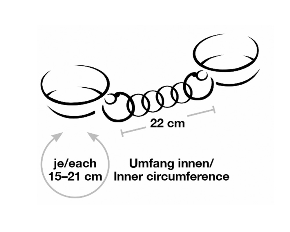 Solidne, wysokiej jakości kajdanki Bad Kitty o stylowym wyglądzie skóry z łańcuszkiem łączącym i metalowymi elementami w kolorze różowego złota. Mankiety od wewnątrz wyłożone miękkim pluszem, każdy z nich posiada kółeczko do przypięcia dołączonego łańcuszka łączącego karabinek. Każda regulowana w obwodzie od 15 cm do 21 cm za pomocą zapięcia na klamrę. Łańcuch łączący z 2 karabinkami o długości 22 cm.
