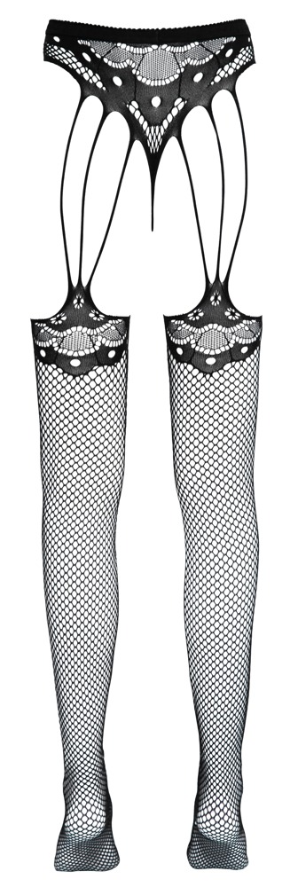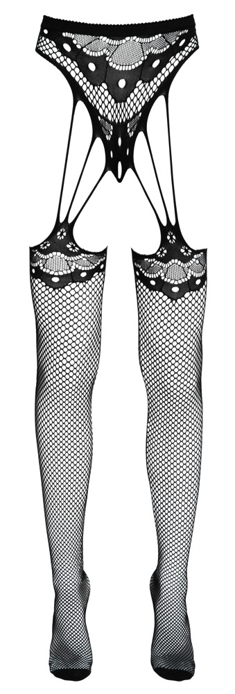 Stringi bez krocza Cottelli LEGWEAR z tkanymi pończochami z przytulnie miękkiej siateczki z finezyjnymi koronkowymi detalami. Pończochy z wzmocnionymi palcami. Kusząco otwarte w kroku. Wszystkie wykonane bezszwowo i bardzo elastyczne dla doskonałego komfortu noszenia.