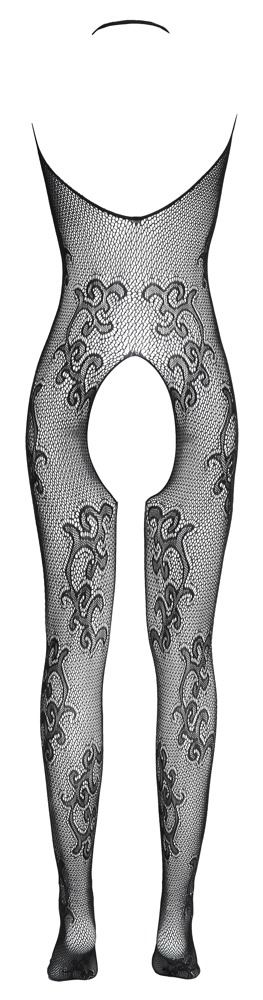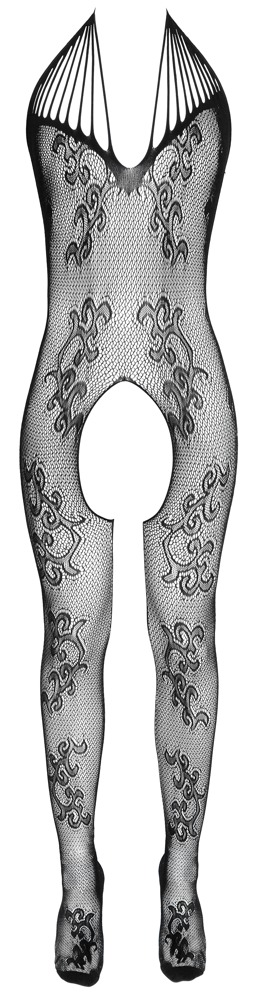 Wyrafinowany kombinezon marki NO:XQSE wykonany z delikatnej siateczki z wplecionymi ornamentami. Elastyczne paski nad dekoltem łączą się w halterneck - tył pozostaje ekscytująco swobodny. W kroku znajduje się obszerne rozcięcie, które umożliwia intymną spontaniczność. Wykonane bezszwowo, miękkie i rozciągliwe dla wysokiego komfortu noszenia. Ze stopą.