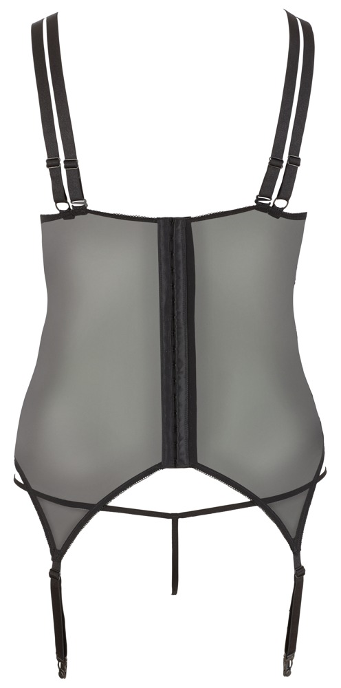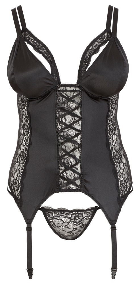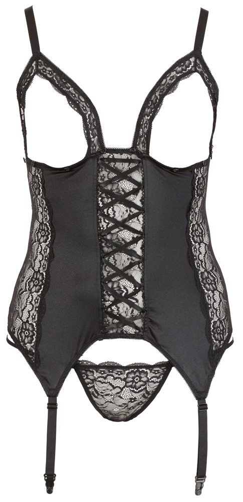 Koszula z regulowanymi szelkami kształtującymi figurę. Z przodu wzmocniona elastyczna satyna, kwiatowa koronka i ciągłe sznurowanie. Z tyłu wykonany z Powernetu z zamknięciem na długi hak. Część biustu z 2 szerokimi paskami i miękkimi miseczkami, które można całkowicie odpiąć, dzięki czemu otwarty biust oprawiony jest tylko w 2 koronkowe opaski. Wliczając w to pasujące stringi.