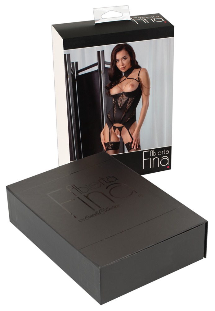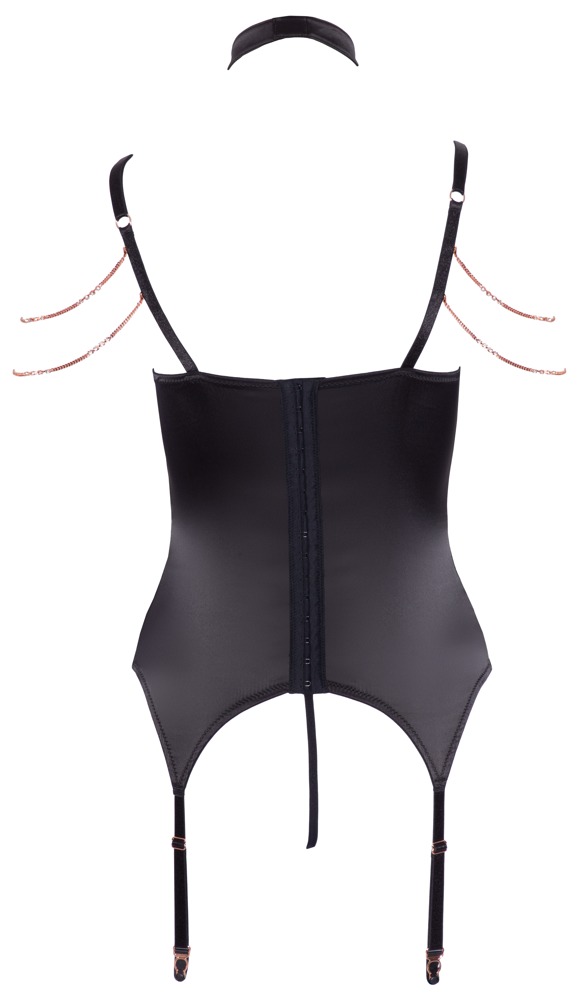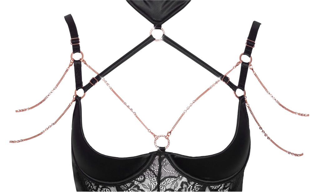 Zmysłowa koszulka do pończoch Abierta Fina wykonana z elastycznej satyny, z przodu ozdobiona koronkowymi wstawkami podkreślającymi sylwetkę oraz biżuteryjnymi elementami w kolorze różowego złota. Wbudowane fiszbiny z lekko wyściełanymi miseczkami sprawiają, że biust jest w doskonałej formie i znajduje się w centrum uwagi. Dwa regulowane paski do dekoltu, które prowadzą od regulowanych ramiączek do zapinanej na rzep opaski na szyję, są wyrafinowane. Ozdobne łańcuszki z dżetami na piersiach i ramionach mają małe karabińczyki i można je zdejmować. Z tyłu zapięcie na haftkę. Podwiązki mają regulowaną długość. Do kompletu dołączone są małe stringi ouvert z elastycznej satyny z odpinanym łańcuszkiem w otwartym kroku.