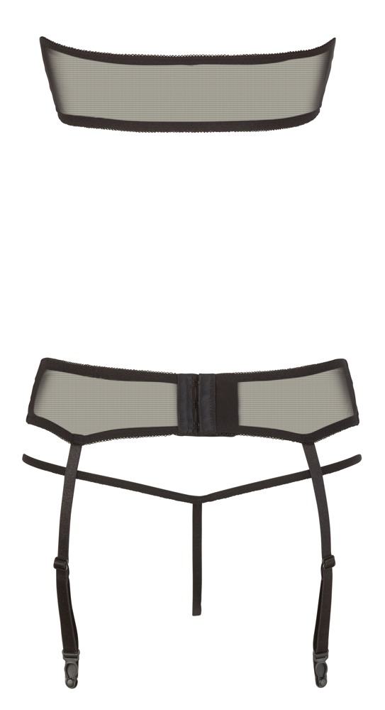 Trzyczęściowy zestaw do szelki, w skład którego wchodzi braletka na szyję z zapięciem klipsowym, pasek do szelki z zapięciem z tyłu na haczyk oraz regulowane szelki i stringi całkowicie bez krocza. Zrobione z czarnej siatki Powernet. Od dekoltu do krocza z czerwonym błyszczącym haftem. Z ciągłym otwartym frontem, połączonym 5 elementami dżetowymi. 100% poliamid.