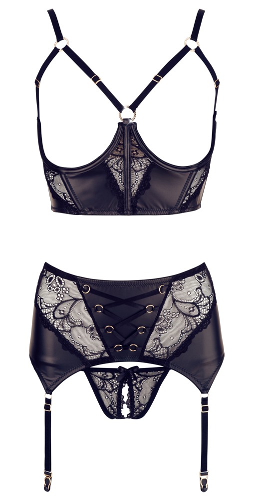 Czarny, trzyczęściowy komplet do pończoch z detalami w kolorze złota to wykwintny strój uwodzicielski. Biustonosz na fiszbinach, zapinany na haftki, z całkowicie otwartymi miseczkami, dzięki wąskim ramiączkom podkreśla biust. Szeroka taśma pod biustem z wbudowanymi paskami wykonana jest z matowo-błyszczącego materiału z koronkowymi wstawkami. Nieco szersza podwiązka również posiada zapięcie na haftki, koronkowe wstawki, kusi 3 paskami podwiązki z każdej strony oraz małym ozdobnym sznurowaniem z przodu. Pasujące koronkowe stringi są zachęcająco otwarte w kroku. Szelki, ramiączka i szelki regulowane.