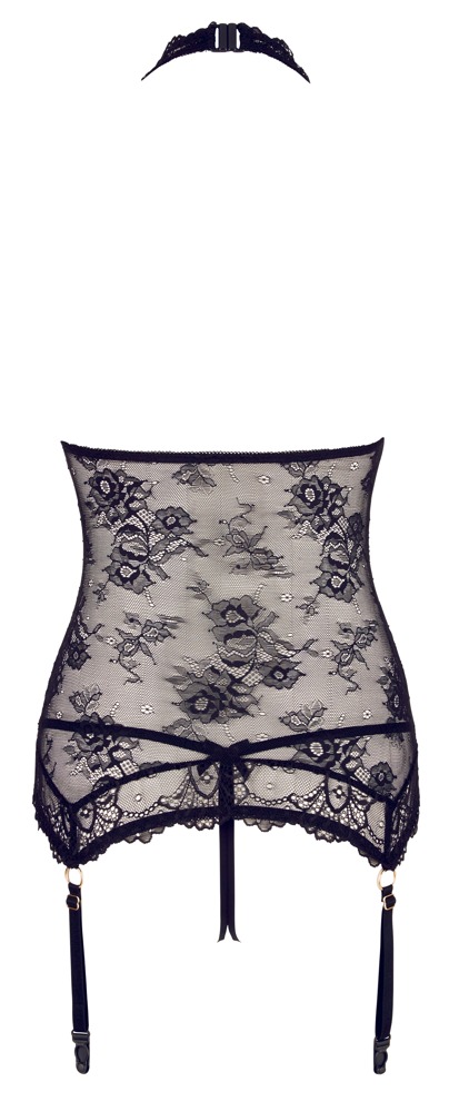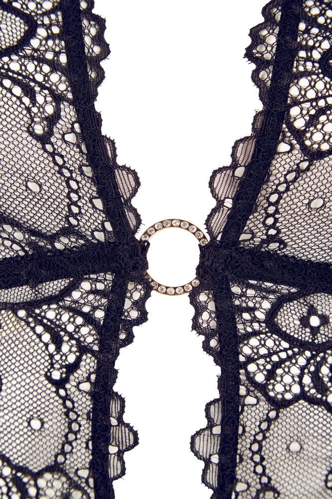 Czarna koszulka na szelkach z dekoltem typu halterneck jest w całości wykonana z wyrafinowanej koronki i urzeka ciągłym otwartym przodem, który jest utrzymywany razem tylko przez cztery złote pierścienie wysadzane dżetami. Miękki materiał zapewnia wysoki komfort noszenia, a cztery szelki przy koronkowym obszyciu mają regulowaną długość. Pasujące stringi kuszą otwartym kroczem.
