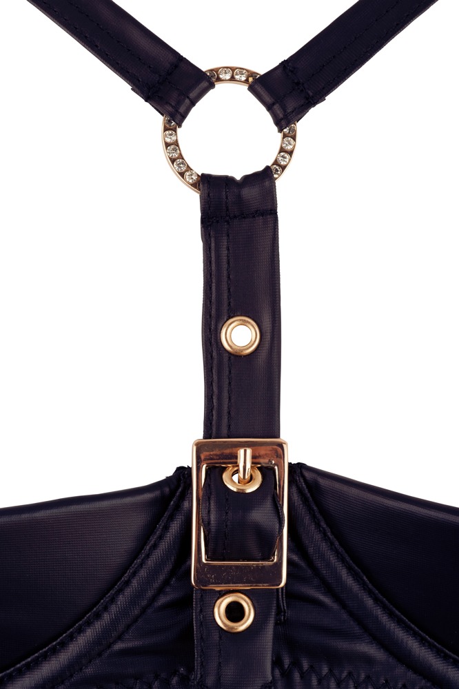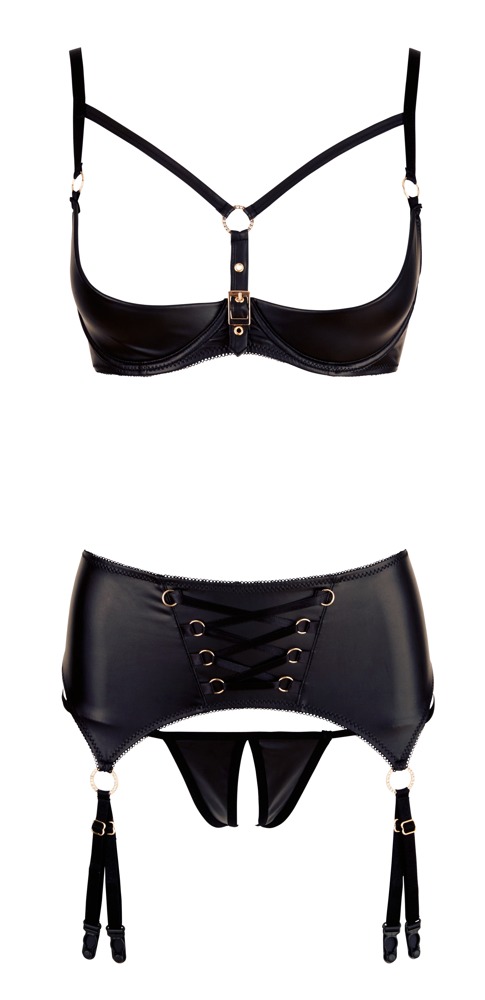 Czarne fiszbiny unoszące biust z zapięciem na haftki doskonale podkreślają kobiece atuty. Ramiączka obejmują biust nad lekko podszytymi miseczkami. Pasujące szelki, również zapinane na haftki, urzekają małym, ozdobnym sznurowaniem z przodu, ponadto po dwie szelki z przodu i z tyłu na stronę (wszystkie regulowane) zapewniają optymalne wsparcie. Dopełnieniem kompletu są dołączone stringi z otwartym kroczem.