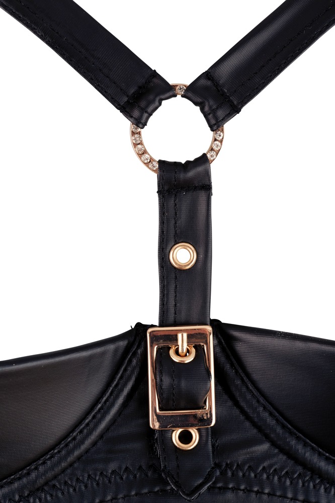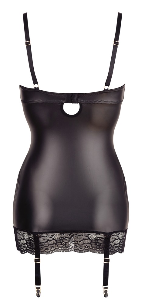 Podkreślająca sylwetkę sukienka bieliźniana z lekko podszytym dołem i paskami. Z przodu sznurowanie i ozdobny pierścień. Szlachetne koronkowe wstawki z przodu i u dołu sprawiają, że seksowny wygląd jest perfekcyjny. Regulowane paski. Paski i szelki regulowane i odpinane. Metalowe detale w kolorze złotym.