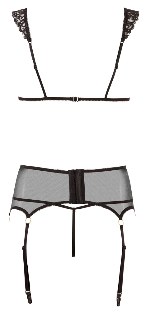 W komplecie z podwiązkami z pięknie haftowanego tiulu, pełne zainteresowanie jest gwarantowane. Miękki biustonosz z otwartymi miseczkami nadaje głębi i wygląda olśniewająco nie tylko dzięki regulowanym ramiączkom z tiulowym wykończeniem. Dzięki zapięciu na zatrzask z tyłu, biustonosz jest łatwy do rozpięcia. Szeroki pas na szelki mieści 6 regulowanych szelek i zamyka się z tyłu na szeroki haczyk. Otwarte stringi stanowią dopełnienie kompletu.