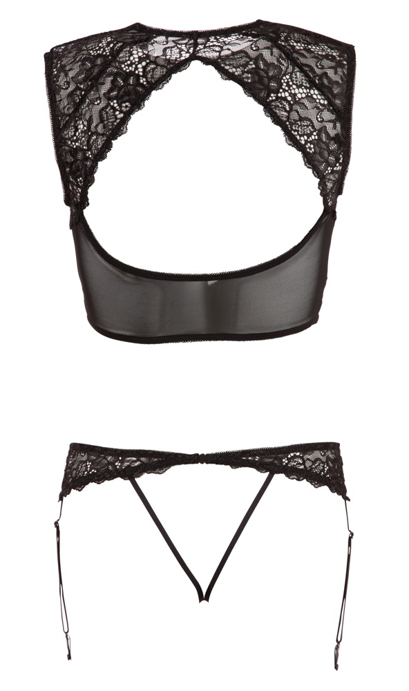 Biustonosz i stringi do pończoch wykonane z koronki. Biustonosz z ozdobą z dżetów przy głębokim dekolcie. Stringi z czterema regulowanymi szelkami, z tyłu zapięcie na klips. Otwarte w kroku.