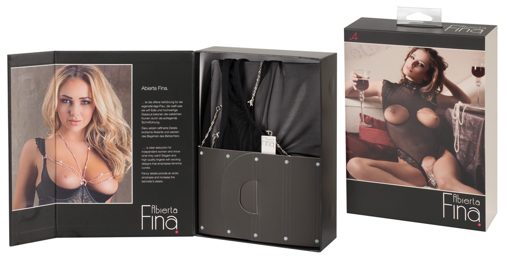 Czarny przezroczysty korpus z koronkowymi wykończeniami na ramionach, kołnierzykiem (2 guziki z tyłu) i wycięciami na nogi. Piersi i wstyd są otwarte i ozdobione zdejmowanymi łańcuchami. 90% poliamid, 10% elastan.