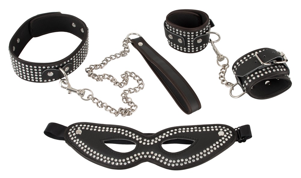 Dzięki temu zestawowi ekscytująco eleganckie marzenia o niewoli stają się rzeczywistością! Wysokiej jakości szekle przylegają do skóry miękką powierzchnią i są regulowane w celu zapewnienia idealnego i wygodnego trzymania. Cały zestaw emanuje elegancją przypominającą divę z wieloma błyszczącymi dżetami.