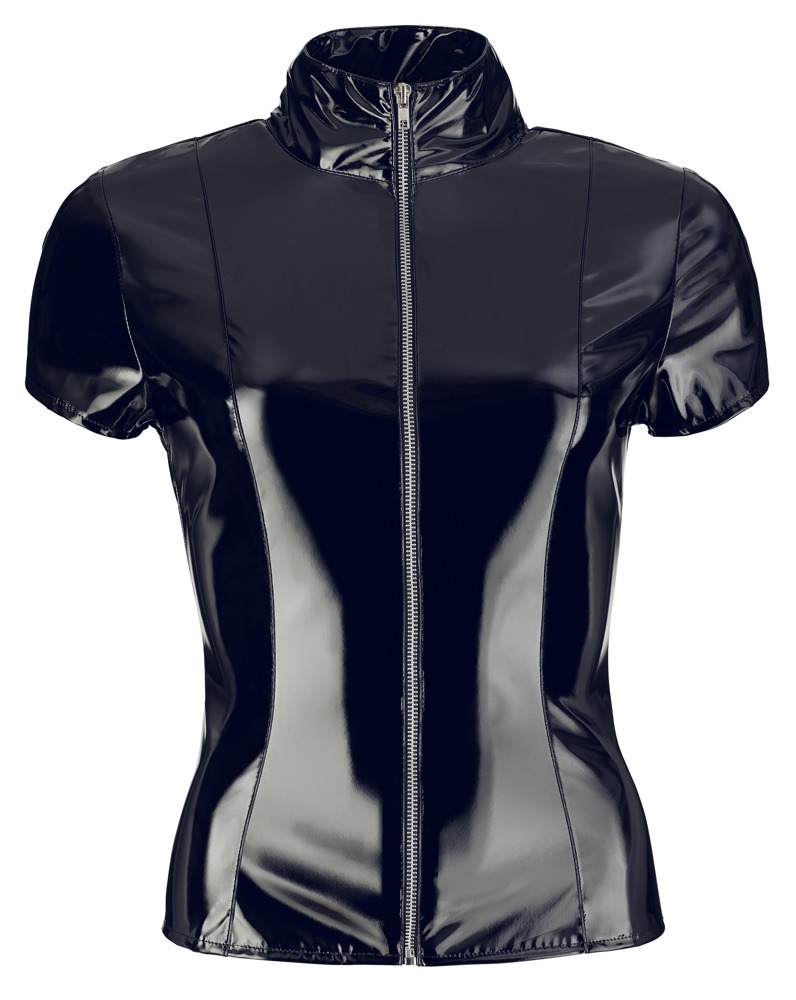 Lekko wcięty top z krótkimi rękawami i kołnierzem stojącym. Wykonane z błyszczącego winylu z charakterystycznym metalowym suwakiem z przodu. Przyjemnie długie cięcie i można je wielokrotnie łączyć.