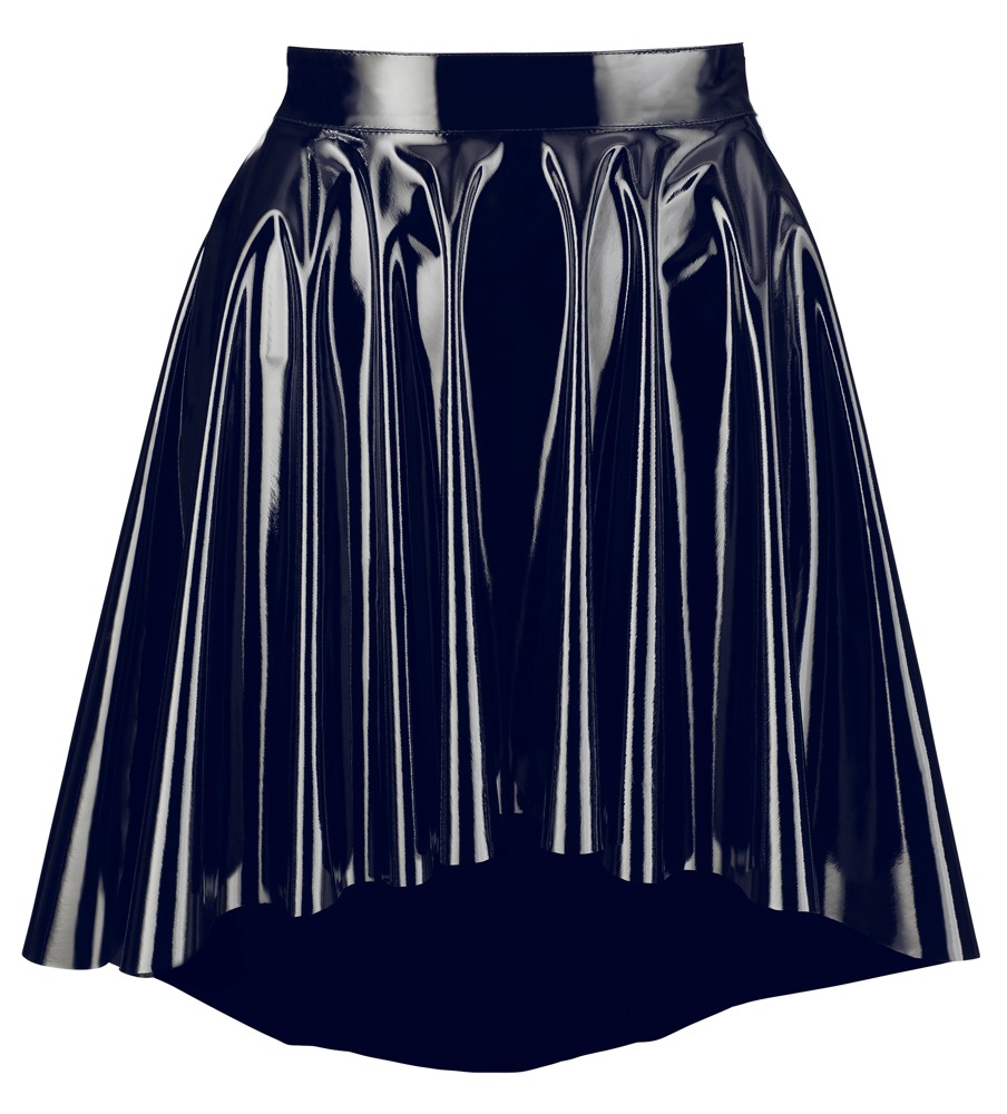 Lekko rozpalona spódnica z błyszczącego winylu. Z ekscytującym fasonem ściółki, dzięki czemu spódnica jest krótsza z przodu niż z tyłu. Pochlebcający figurze wszechstronny, który można łączyć na wiele sposobów.