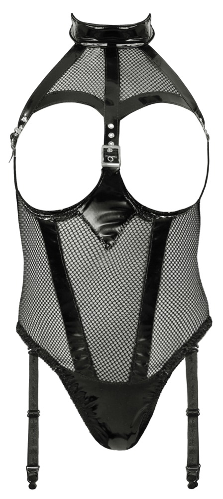 Urocze body bez biustu z wszytym kołnierzykiem z zatrzaskami. Wstawki z siatki zapewniają ekscytujący wgląd i kuszą do działania.... Z regulowanymi zapięciami nad biustem oraz regulowanymi i odpinanymi szelkami.