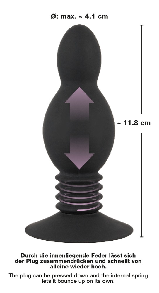 Czarny klasyczny korek doczołowy na stabilnej podstawie ssącej, który sprężynuje w górę i w dół, gdy ciśnienie jest podawane od góry. Swoją aksamitnie jedwabistą powierzchnią bez trudu wnika w intymne głębie i daje mu niepowtarzalne uczucie ekstazy analnej (a nawet pochwowej).