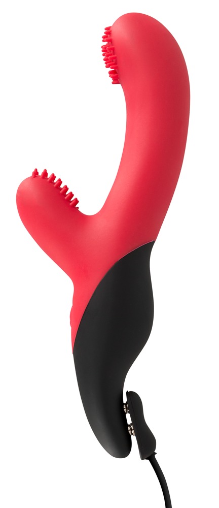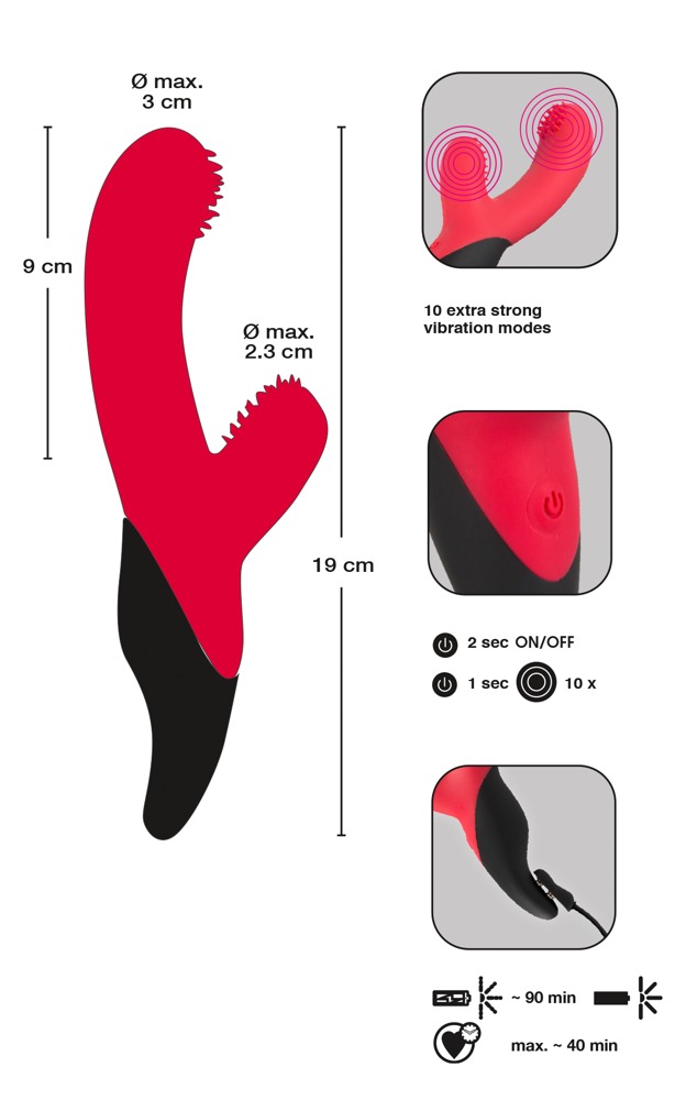 Aksamitny wibrator królik z 10 potężnymi trybami wibracji. Dzięki anatomicznemu kształtowi doskonale dopasowuje się do kobiecych konturów i jest przyjemnie elastyczny. Zmysłowe wypustki na trzonie i stymulator łechtaczki zapewniają dodatkowe mrowienie przyjemności.